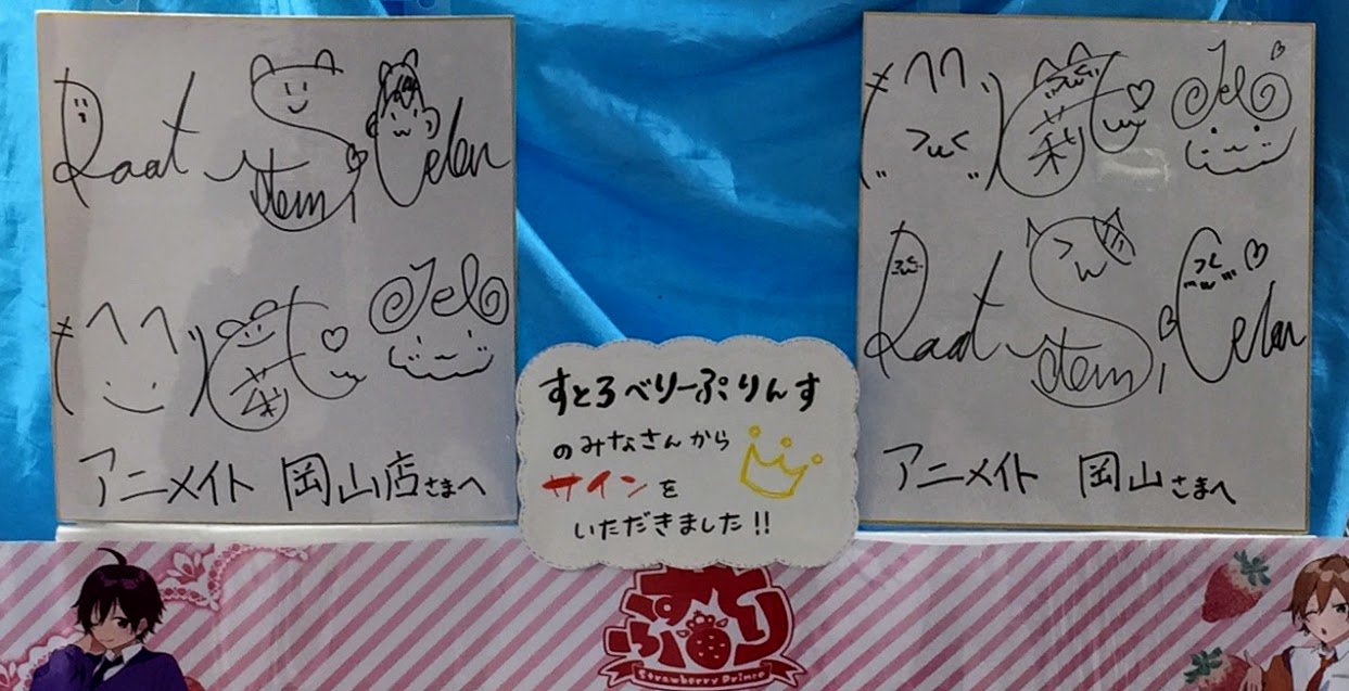 アニメイト岡山 お知らせ サイン色紙の展示場所をすとぷりモニター上に変更したモモ また 併せて前回の すとろべりーすたーと 発売時に頂いたサインも展示中モモ 写真撮影okモモぉぉ うぉぉぉお お店でお待ちしているモモォ